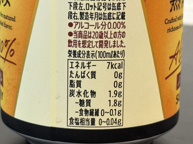 原材料を見ると、麦芽・ホップ・スピリッツエキス(ノンアルコール)、食塩、香料、酸味料、カラメル色素、苦味料とのことで、甘味料は入っていない模様。