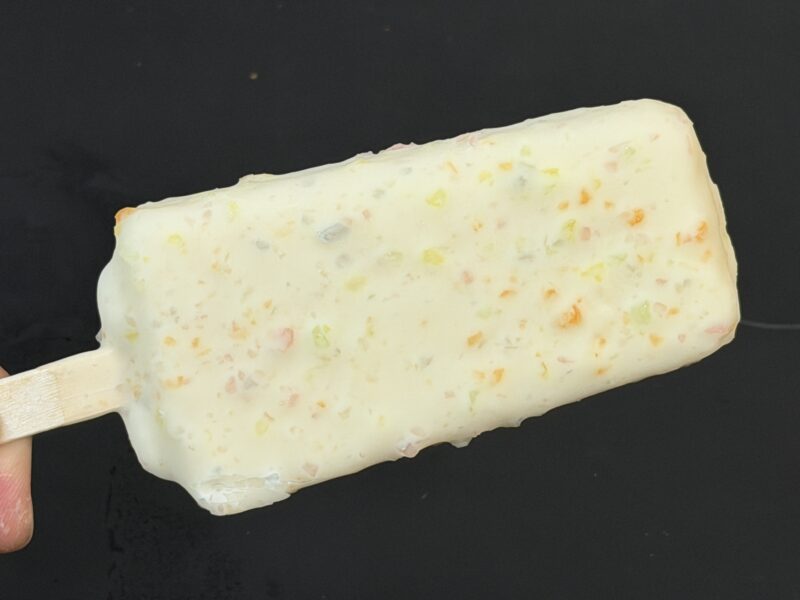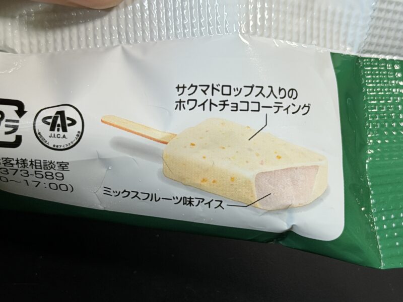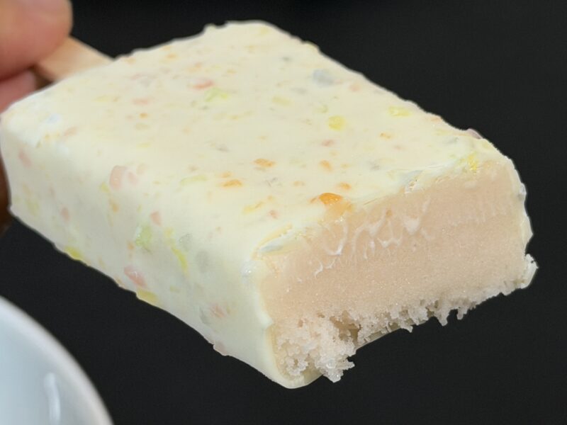 そして、中のアイス部分は濃厚なミックスフルーツ味。とろみのあるアイスというか、ねっとりとした食感で、フルーツたっぷりなのが味からも食感からも伝わってきます。