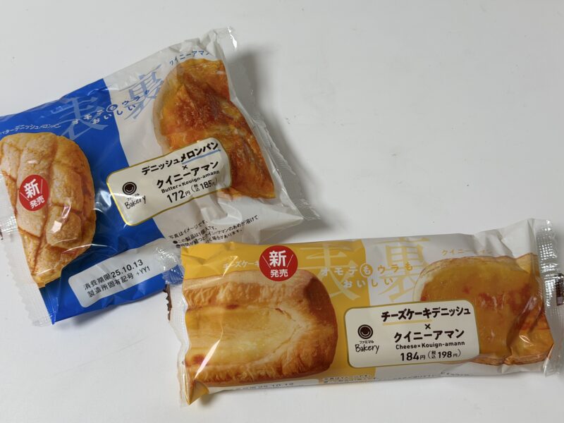 ということで紹介するのは、2025年10月7日から発売開始した、ファミマの「人気パンをひっくり返すと、クイニーアマン!?オモテもウラもおいしいパン」シリーズ。