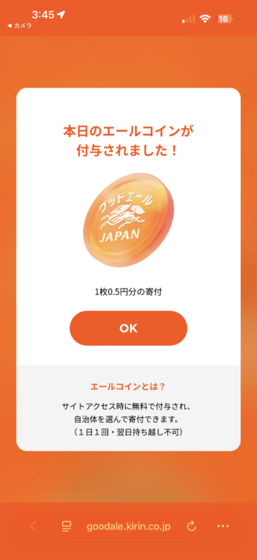 QRコードでサイトにアクセスすると、エールコインというものが1日0.5円分、付与されます。