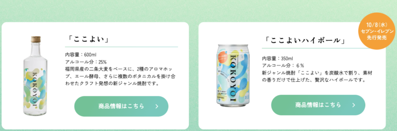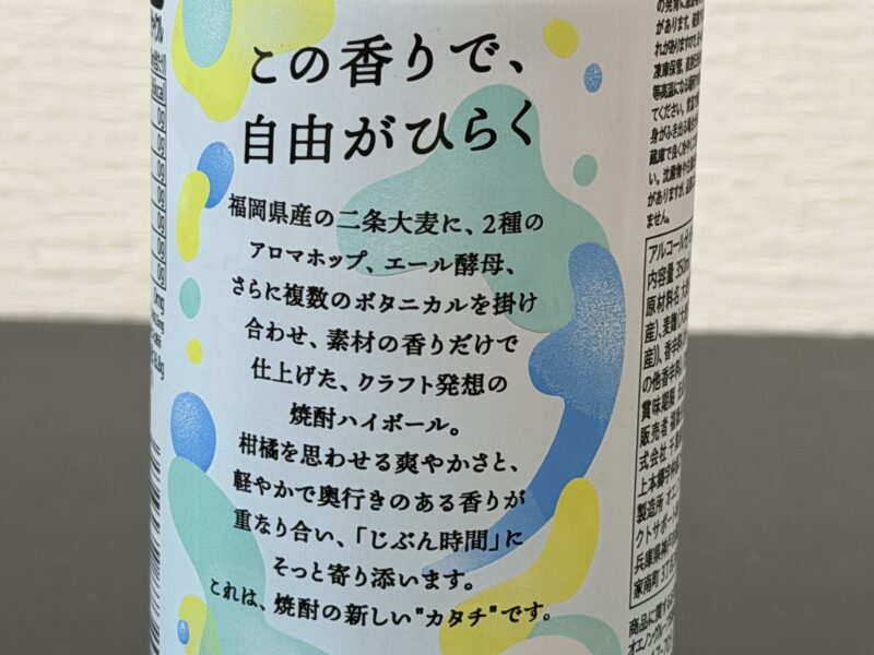 調べてみると、このKOKOYOI(ここよい)は、福岡県産の二条大麦をベースに、2種類のアロマホップ、エール酵母、さらに複数のボタニカルを掛け合わせたクラフト発想の新ジャンル焼酎を使っているようです。