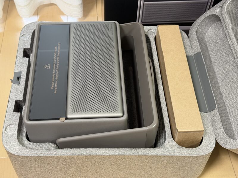 XGIMI HORIZON 20 Proを取り出してみました。隣の小さな段ボールの中に、電源コードやリモコンが入っています。
