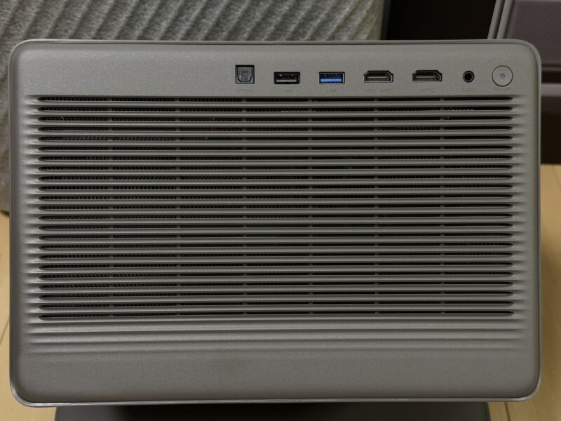 右上部に、電源ボタン、HDMIが2つ、USBが2つ、オプティカル端子、イヤホン端子がついています。