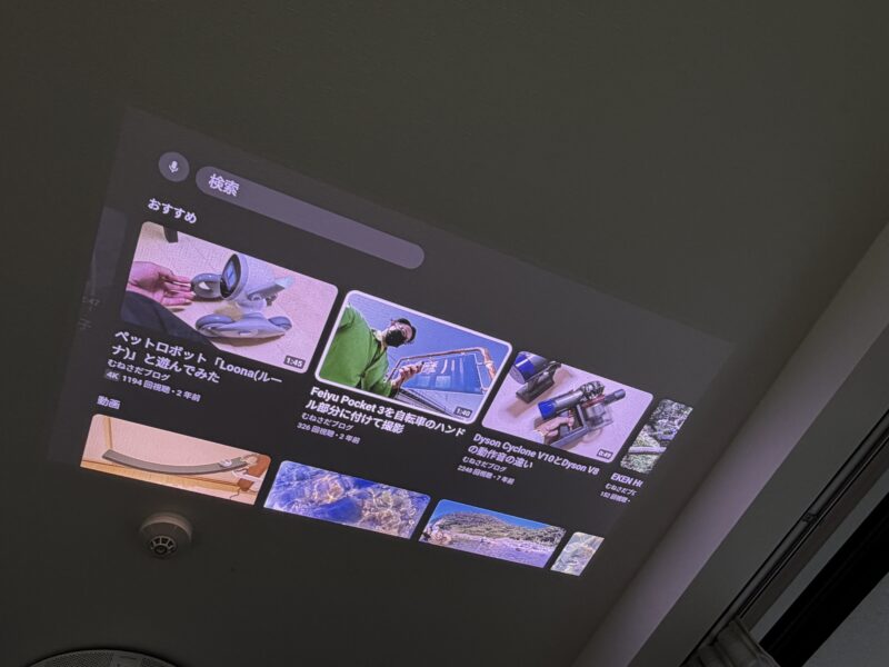 天井にもめちゃくちゃ明るく綺麗な状態で画面が表示されるので、寝ながら動画を視聴する、なんて幸せなことができますね。