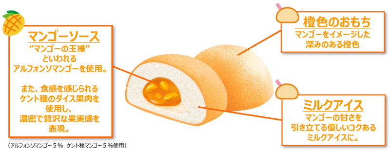 クリーミーで軽いくちどけのアイス、果実の味わいの感じられるマンゴーソースを橙色のお餅で包んだ商品。
