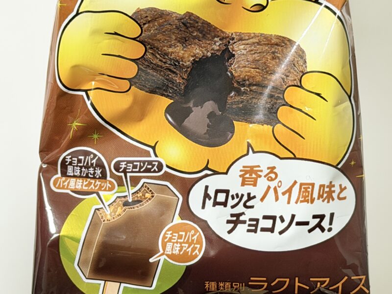 ガリガリ君リッチシリーズで、チョコパイ風味かき氷の中にパイ風味ビスケットが入っており、さらにはその中にチョコソースが入っています。