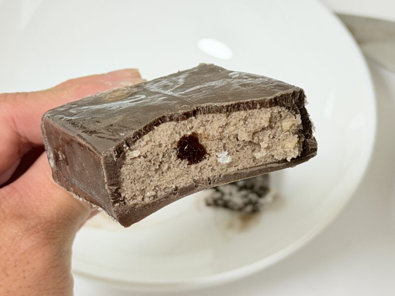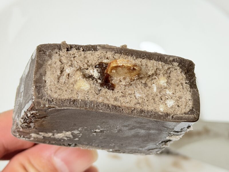 実際に食べてみると、外側がしっとりとしたコーティングで、中はガリっとしたかき氷アイスの中にサクッと食感のビスケット。そして中央にトロリとした食感のチョコソースと、複雑な食感と味わいが組み合わさっています。