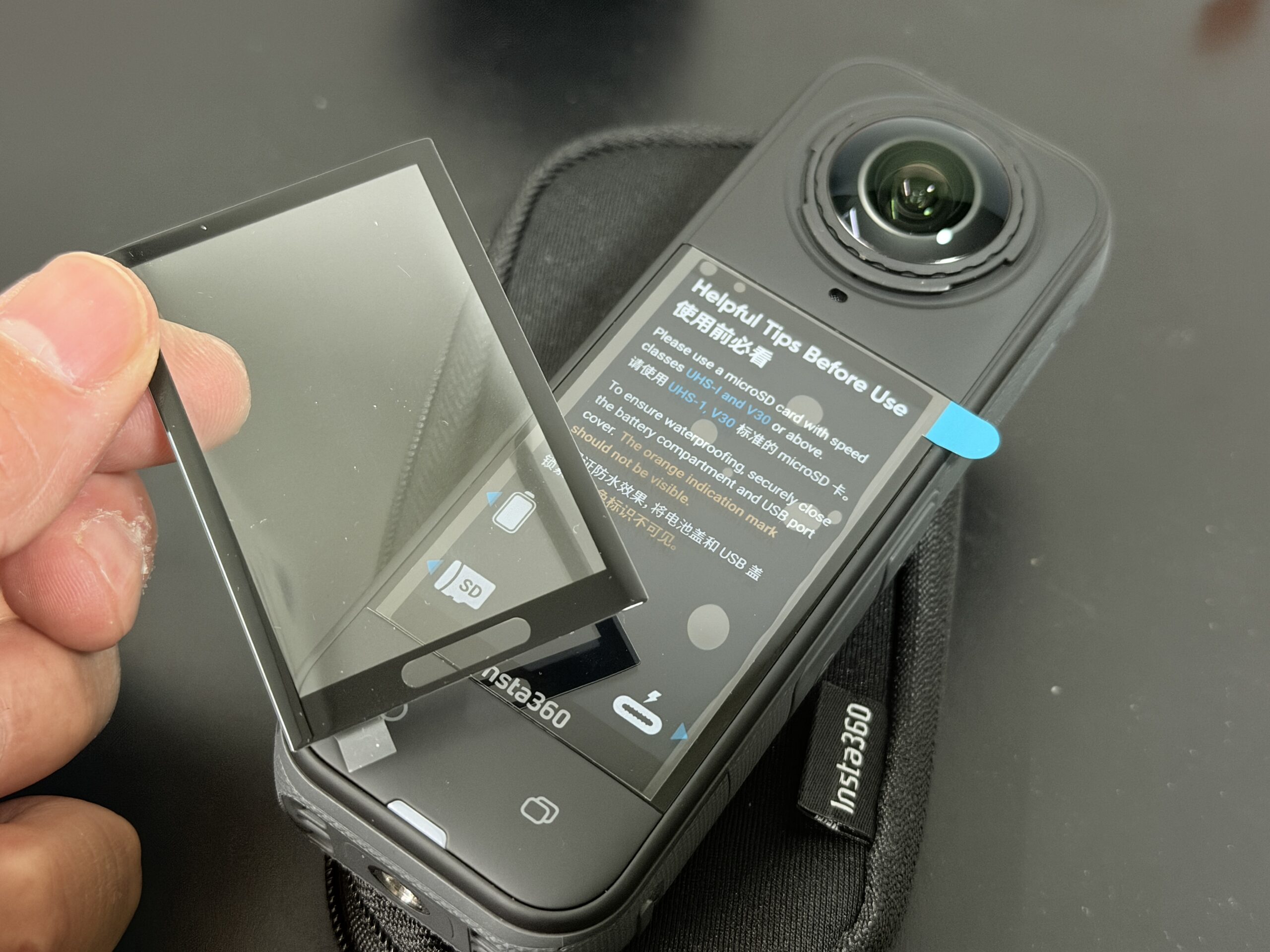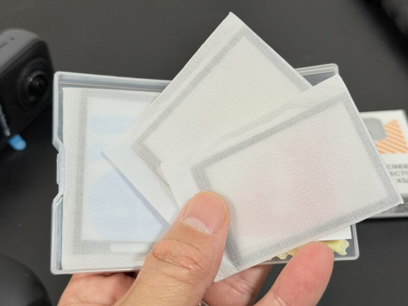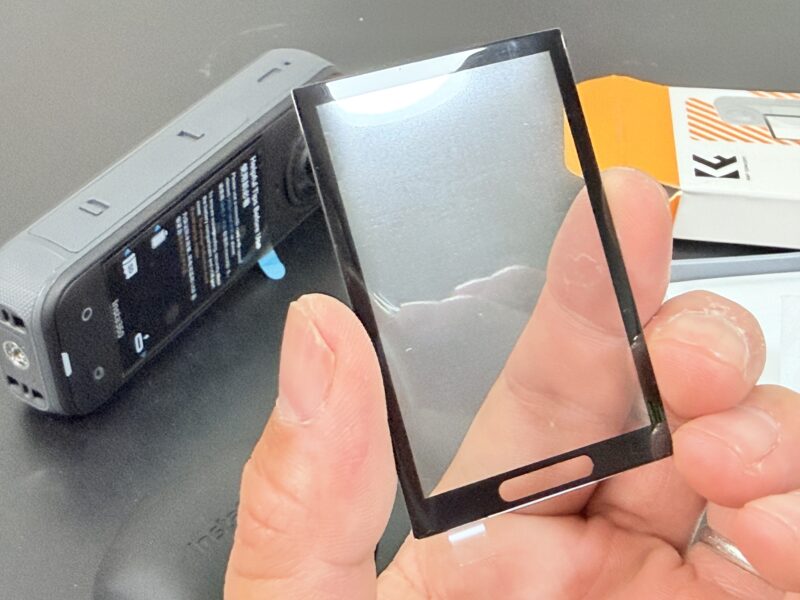 その360度カメラ、Insta360 X5の液晶部分を保護するためのガラスフィルムはサードパーティー製を選択しました。