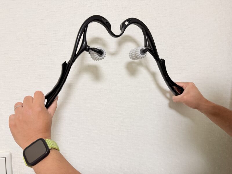 ハンドル部分を持って広げることでグッと広がるので、これで大きく広げれば首や太ももが太い人でも使うことができますし、広げる大きさを小さくすればそれだけ締め付ける力が強くなってマッサージの強度も強くできます。