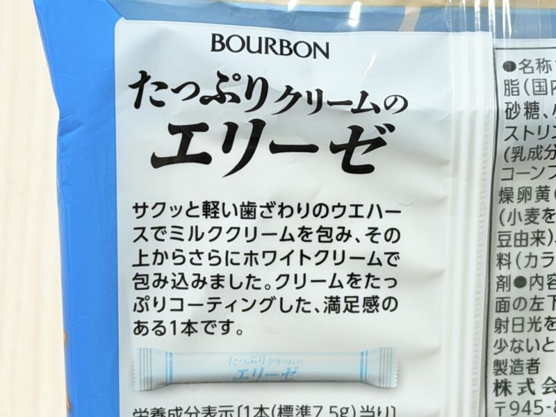 エリーゼと言えば、サクッと軽い歯触りのウエハースが特徴的ですが、内部にミルククリームを包み込み、さらにはウエハースの上からホワイトクリームで包み込んでいるとのこと。