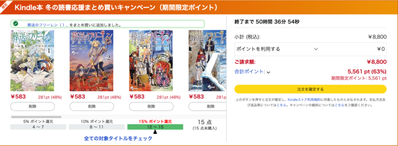 もちろん、このキャンペーンではない方のポイント還元(48%オフ)は単体購入でも付与されますので、最初の15冊ほどは48%+15%ポイント還元つけつつ、残りは48%分のみにして購入でも十分お買い得だと思います。