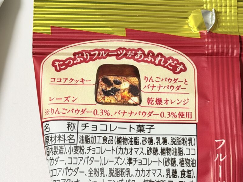 フルーツの方は、ココアクッキー・リンゴパウダーとバナナパウダー、レーズン、乾燥オレンジが入っています。