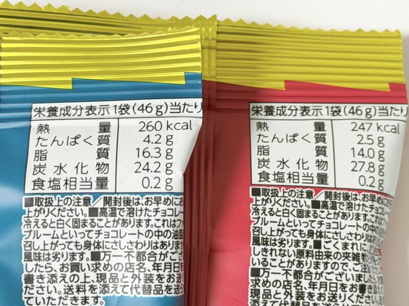 カロリーは1袋あたりそれぞれ、ナッツが260kcalで、フルーツが247kcalとなります。