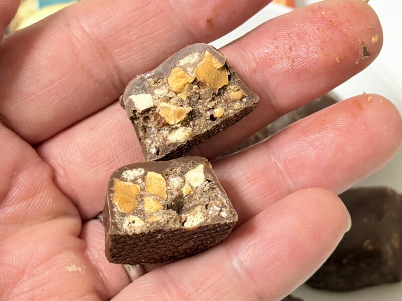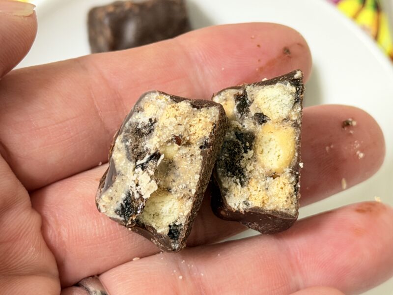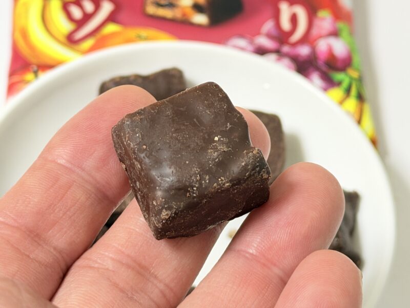 食べて見ると、サクッとした食感に弾力のあるレーズンや爽やかなフルーツの味わいが口の中に広がります。食感にブラックサンダー感を感じます。