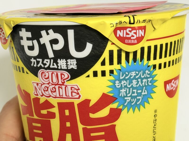 なんと、レンチンしたもやしを入れてボリュームアップのカスタム推奨のカップヌードルなんです。