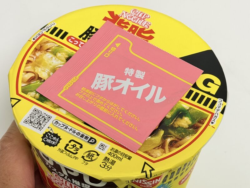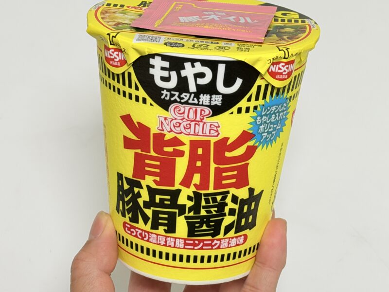 見た目からもわかるように、二郎系を意識した背脂豚骨醤油味のカップヌードル。