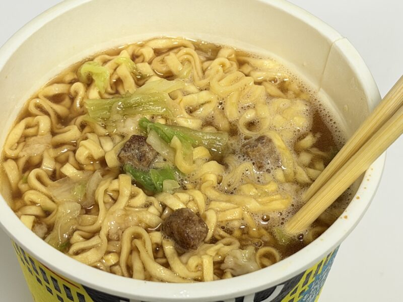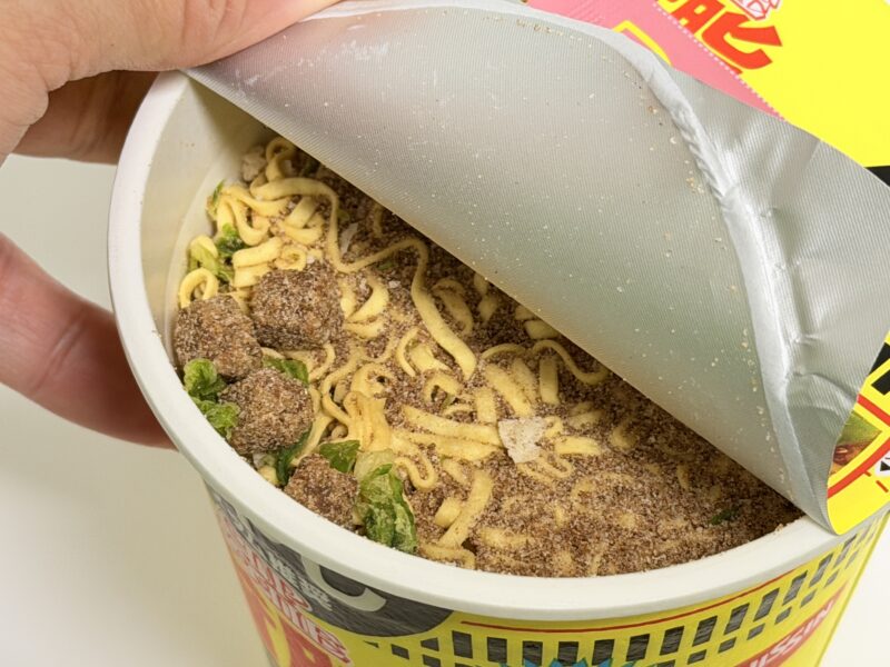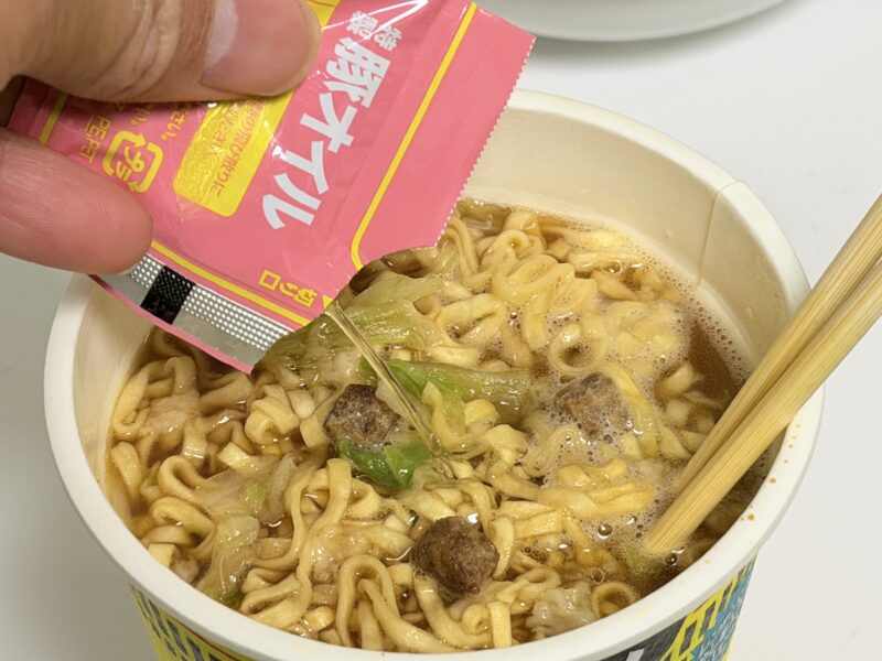 こちらが3分経過したカップヌードル 背脂豚骨醤油 ビッグ。