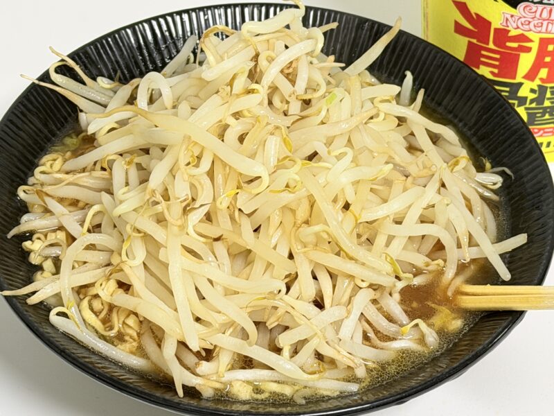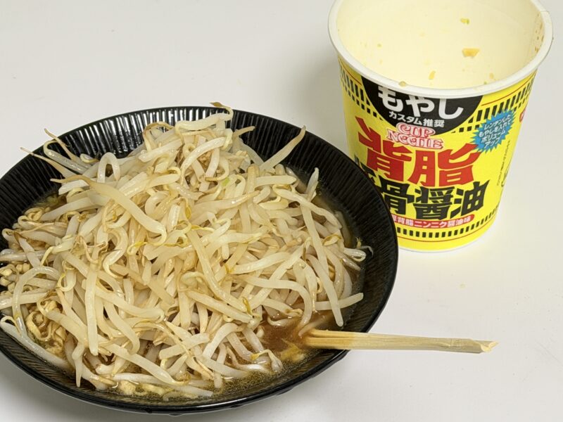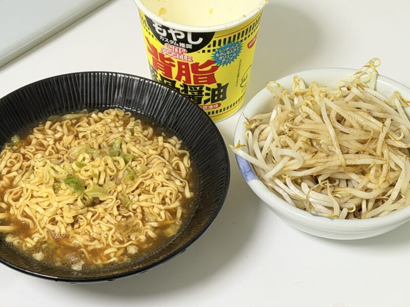 実際に、もやし1袋をレンチンして追加してみましたが、どうせなら鍋でもやしを茹でつつ、ついでに豚肉とかも茹でて見るのもありかな、と思います。そして、その茹で汁でカップヌードルを作ればより濃厚な味わいになりそうですね。
