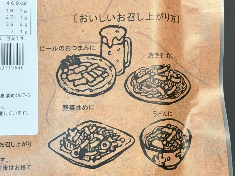 ビールのおつまみ、焼きそばやうどん、野菜炒めに入れても美味しいそうです。