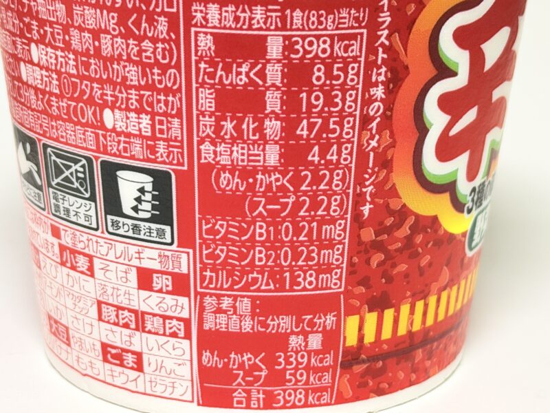 カロリーは1食当たり398kcal。カップヌードルとしては少し高めです。