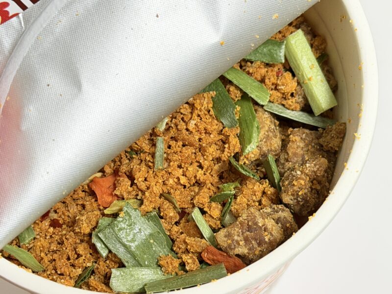 具材は、”謎肉” (大豆たん白入り豚ミンチ)、キャベツ、ニンジン、ニラ、赤唐辛子。