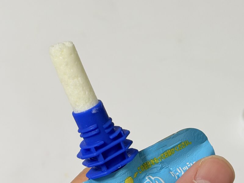 蓋をパキッと開けて、少しグニグニと袋をもみほぐしてグイッと押し込むと、飲み口からヒューッと伸びる、美味しそうなアイス!