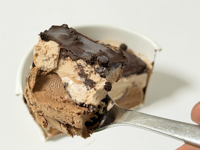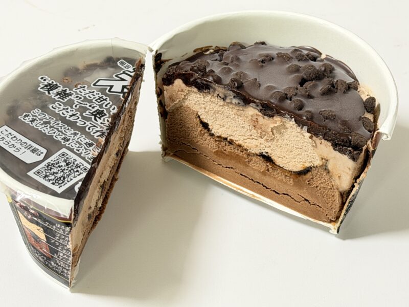 一番上のクッキー&チョコレートの層、その下にチョコアイス。黒いトロリとした部分がチョコソースで、一番下がビターチョコアイスです。