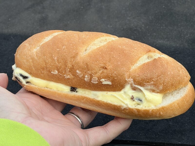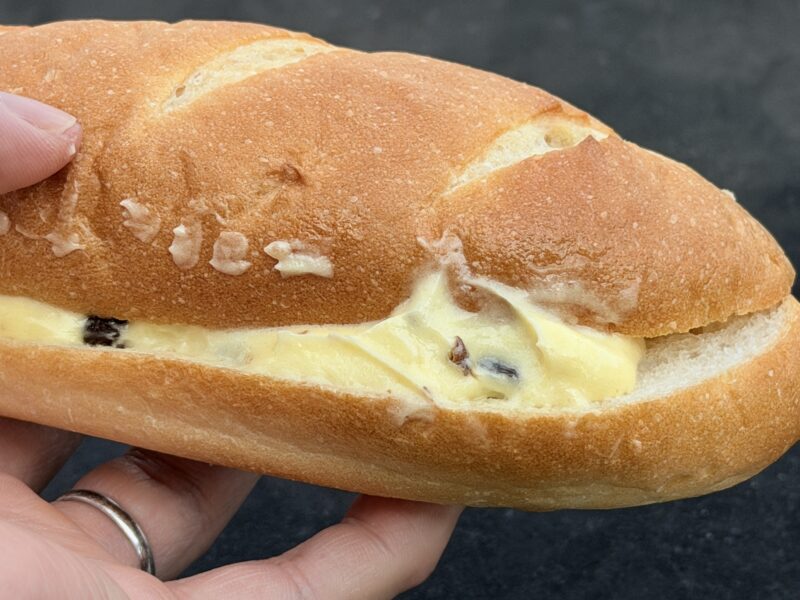 ソフトフランス生地のパンの中に、ラム風味レーズンとバター入りクリームが入っています。