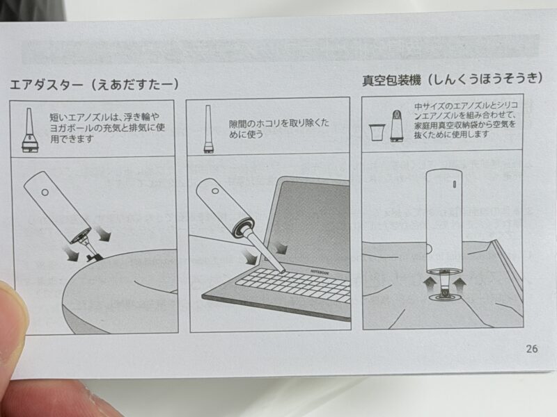 エアダスターとしてホコリを吹き飛ばす用に使えたり、浮き輪などを膨らますポンプとして使ったりできるんです。