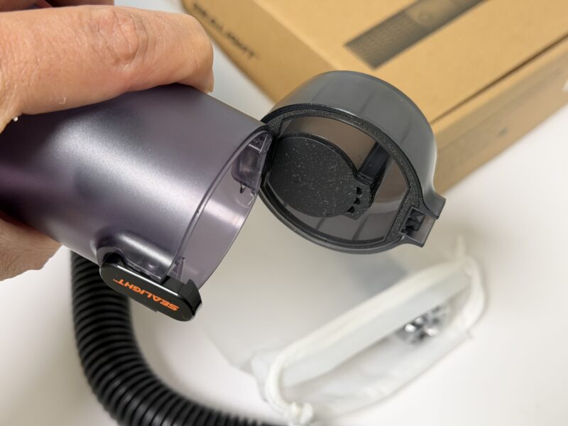 フィルター部分の掃除もここをひねれば外れますし、ゴミだけ捨てるならば、上側のSEALIGHTというロゴ部分を押せば、パカッと開いて捨てることができます。