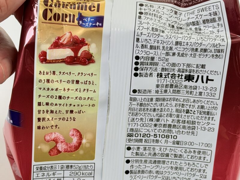 食感はしっかりとキャラメルコーンで、その良さを外すことなく美味しくベリーチーズケーキ味に仕上げていると思います。