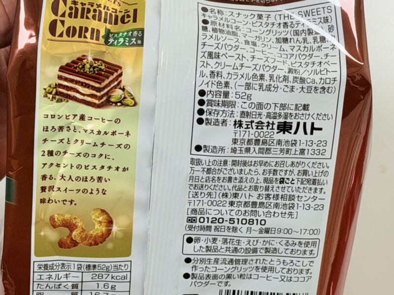 ということで紹介しました、キャラメルコーン・ピスタチオ香るティラミス味。最初はチーズの香りが強く、好き嫌いが別れるかな?と思いましたが、食べてみるとキャラメルコーンとしての美味しさを引き立てるようにコーヒーとチーズの美味しさが加えられていて、美味しいキャラメルコーンに仕上がっていました。
