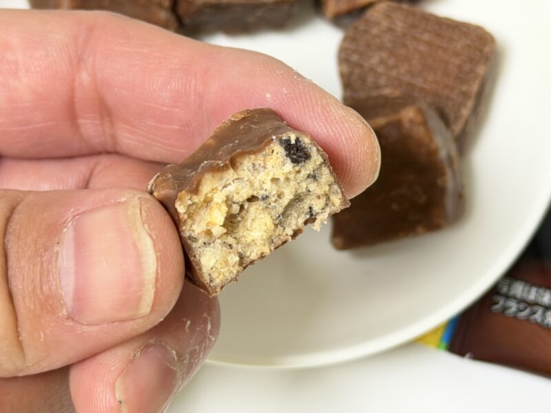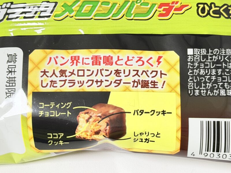 ブラックサンダーらしく、チョコレートコーティングされている見た目の中には、ココアクッキー・バタークッキーとともに、メロンパンの歯応えを出すための「しゃりっとシュガー」が入っています。