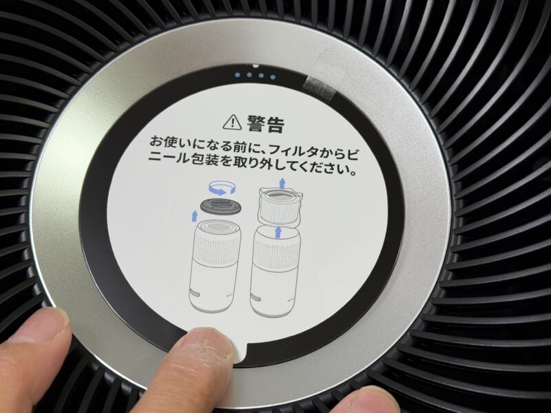 操作パネル部分に、「使用前にフィルタからビニール包装を取り外して」という注意書きが。親切!