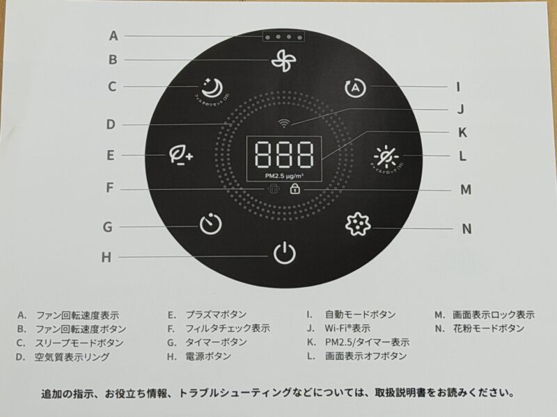 基本は、H:電源ボタンを押せば電源がONになります。とにかく空気清浄機にお任せしたいという人は、I:自動モードボタンを押せばあとは放置でも良いくらいです。