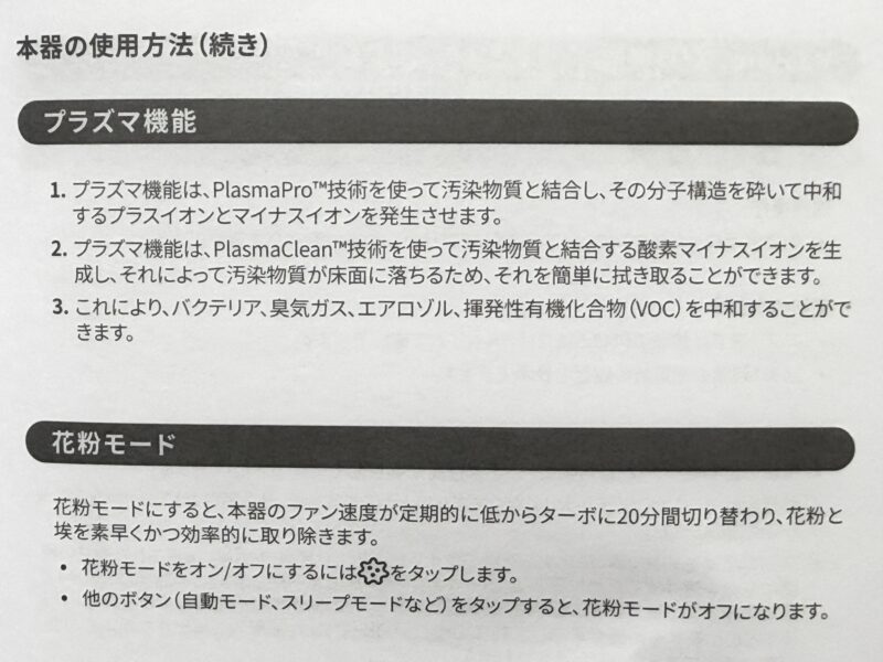 この「Levoit(レボイト)」の上位モデルにだけ搭載されているのがこの「プラズマ機能」と「花粉モード」2つの機能。