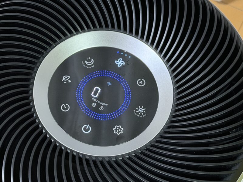 あとは、睡眠時に急にハイパワーにならないように、C:スリープモードボタンがあったり、手動で強弱設定できるボタン、パッと見で室内の空気品質をチェックできるリングの色・数値表示などもあります。