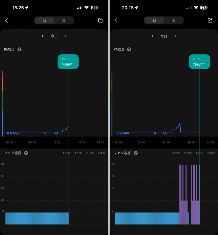 この辺り、アプリを使わなくても数字として見えるので、「普段目に見えない空気清浄の可視化」がされていてわかりやすいです。