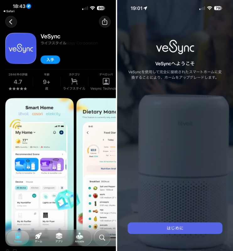 まずは、スマホに「VeSync」アプリをダウンロードしましょう。