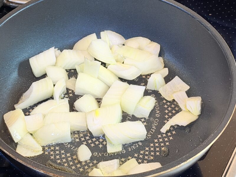 オリーブオイル大さじ1、フライパンに入れ、まずは玉ねぎを炒めます。