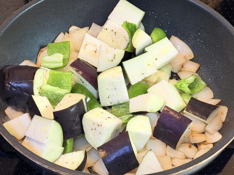 玉ねぎに油が回ったら、ナスとピーマンも投入。しんなりするまで炒めます。