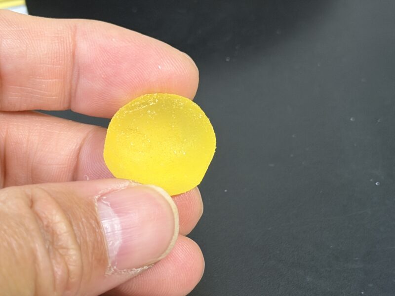 実際に食べてみると、弾力のあるハードグミのような外側と、とろけるように柔らかい内側のグミの食感で、味はしっかりとしたりんご味。