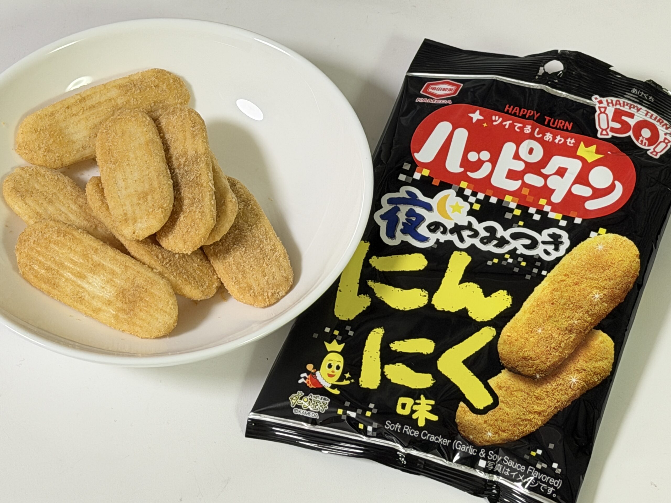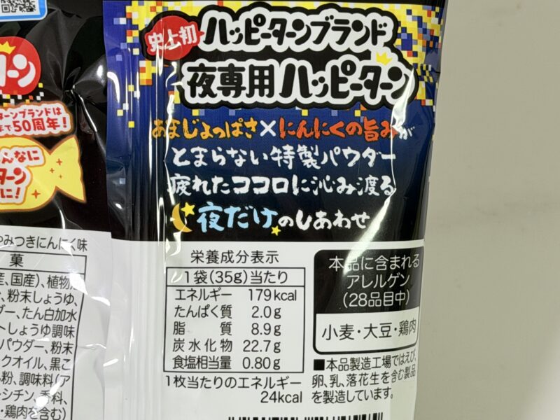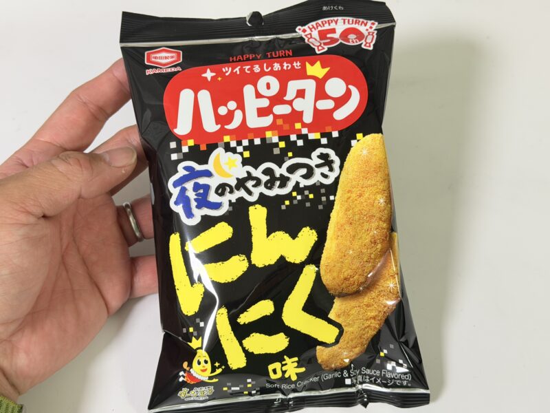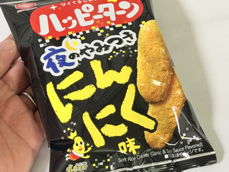 ということで紹介しました、ハッピーターン 夜のやみつきにんにく味。