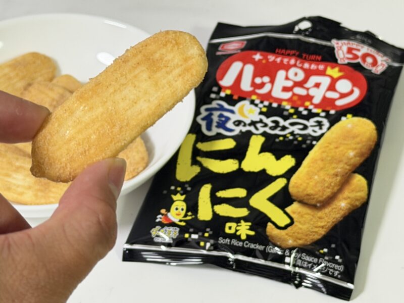 一口食べてみると、ハッピーターンらしいあまじょっぱさに加えて、にんにくの香りがガツンとします。