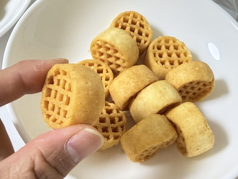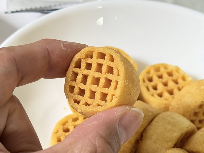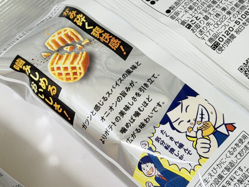 さっそく、まずは「スパイスしお味」から食べてみると、しっかりとしたブラックペッパーとオニオンの味わい。ザクザクとした噛みごたえがあり、一口で食べるのが大変なほど。