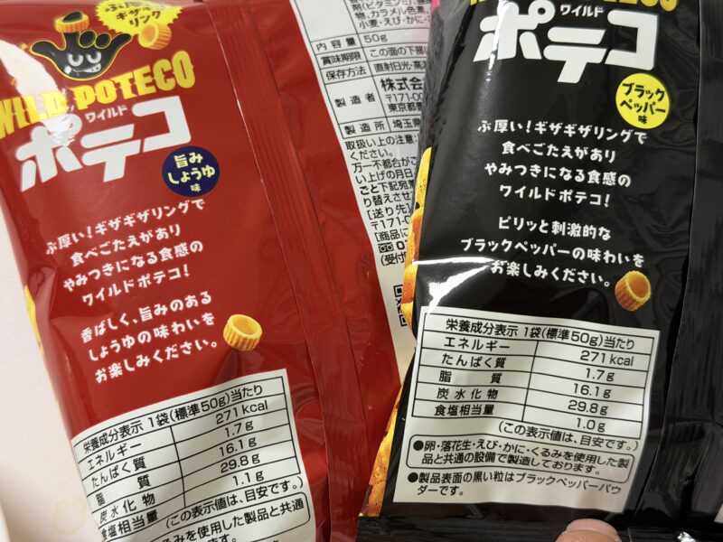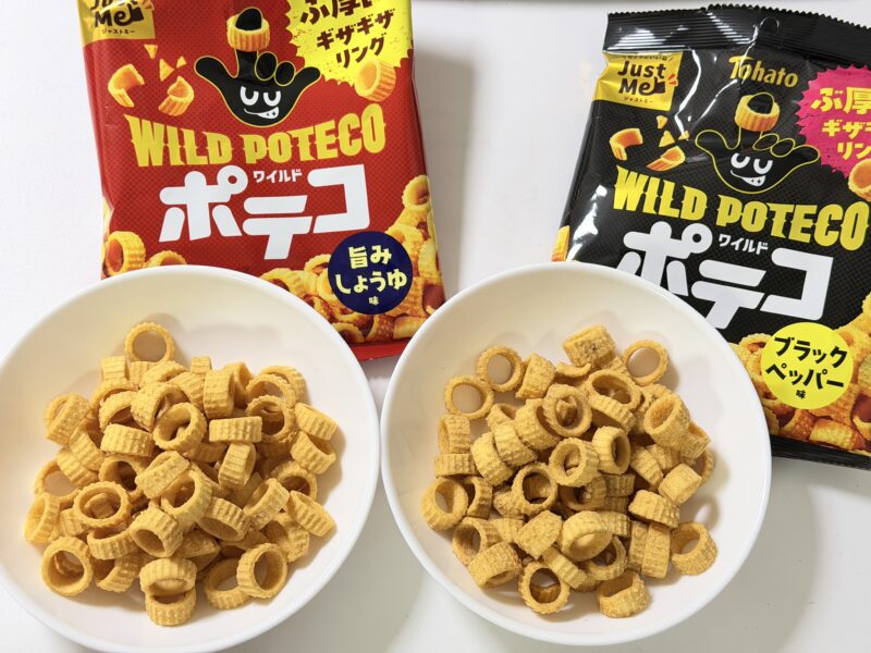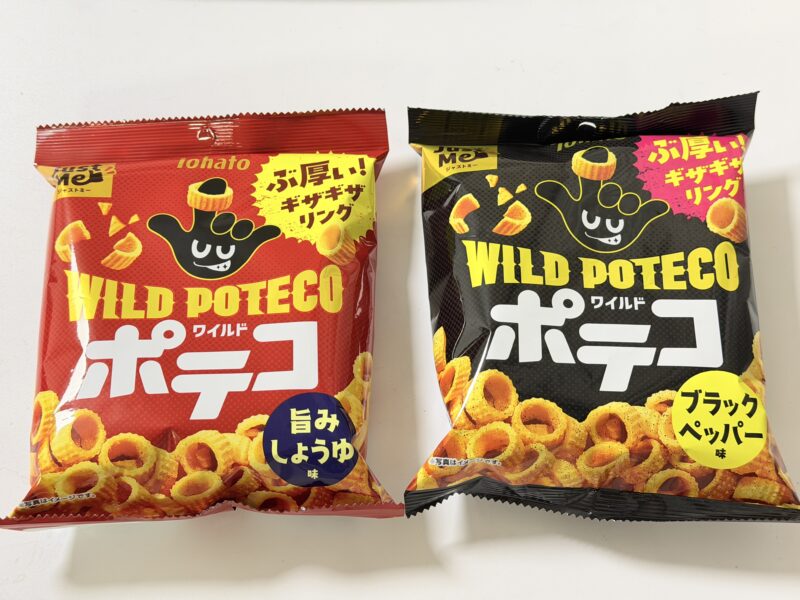 ということで紹介しました、「ワイルドポテコ・ブラックペッパー味」と「ワイルドポテコ・旨みしょうゆ味」。