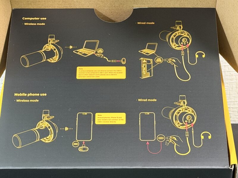 左上がマイクスタンド。右上がマイク本体。その下にPC接続用のUSB Type-Cケーブルと、ワイヤレス接続用のUSB Type-Cアダプタ+延長ケーブル。そして説明書となります。