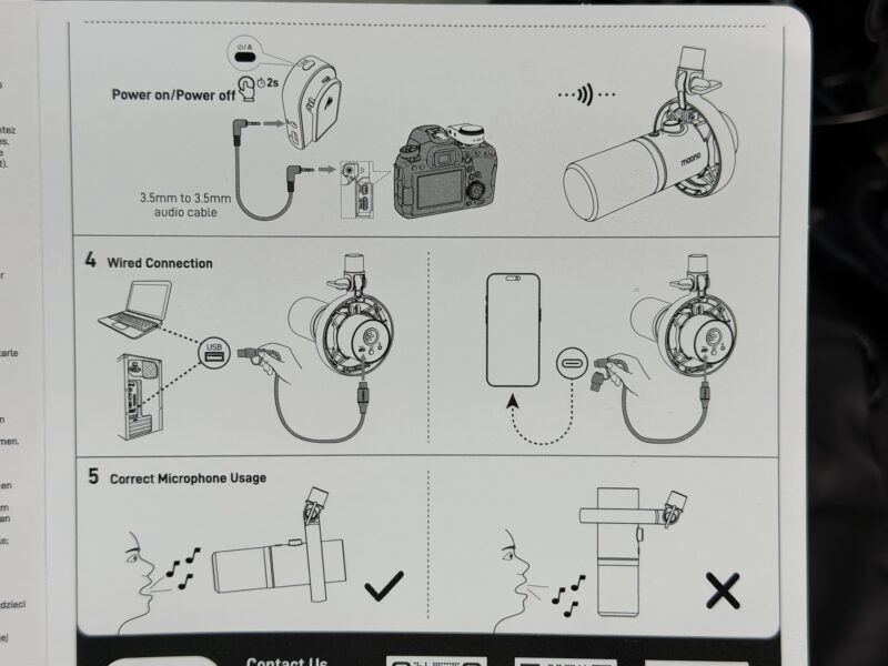 スマホともワイヤレスでも有線でも接続できるよ、と書かれています。イメージがつきやすいので良いですね。こういうイラストでの説明。