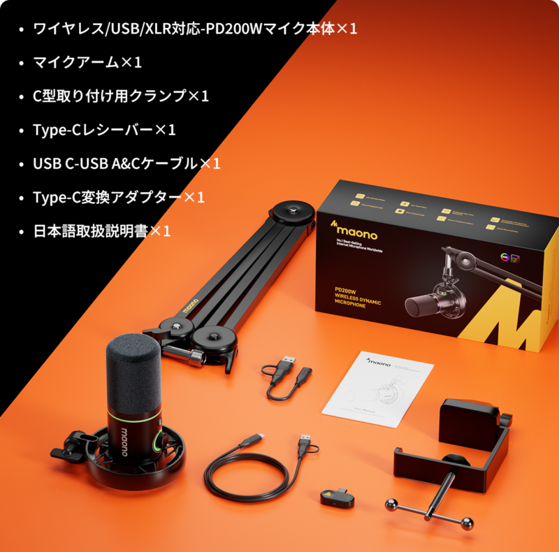 ということで紹介しました、USB・XLR・ワイヤレスの3Wayダイナミックマイク「Maono PD200W Hybrid」。
