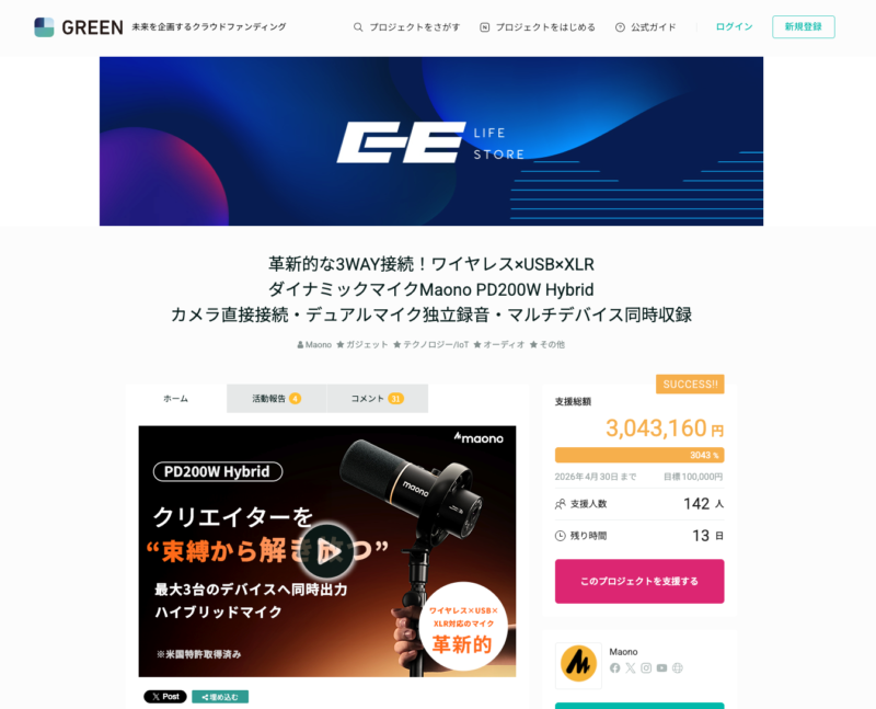 ということで紹介するのは、現在greenfundingにてクラウドファンディング中のUSB・XLR・ワイヤレスの3Wayダイナミックマイク「Maono PD200W Hybrid」。